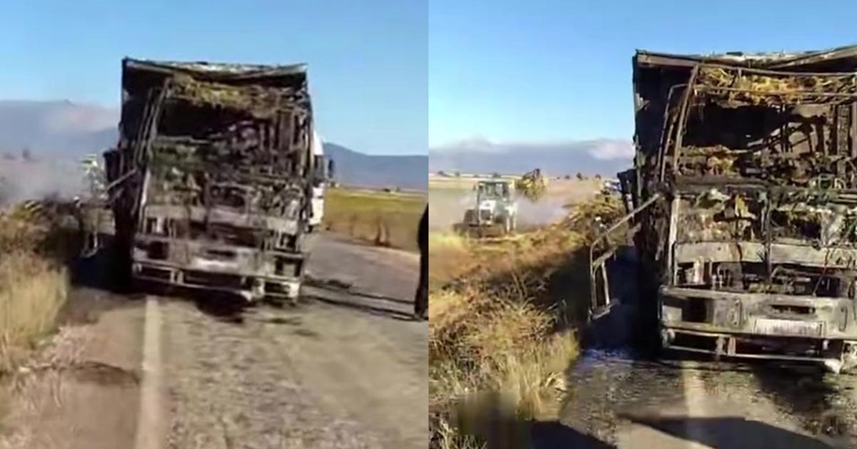Denizli’de saman yüklü kamyon yangın sonrası kullanılamaz hale geldi.