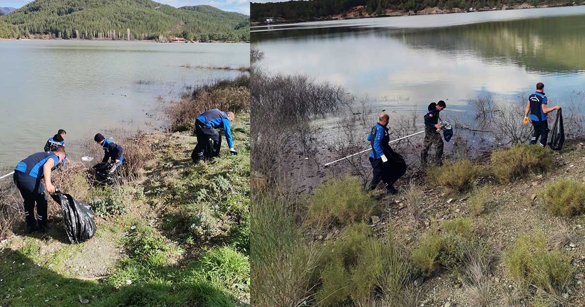 Yaz aylarında suların çekildiği, kış aylarında ise yoğun yağışlarla yeniden yükselen Ula Göletinde, suyla birlikte doğaya zarar verebilecek atıkların birikmesini önlemek amacıyla temizlik yapıldı.