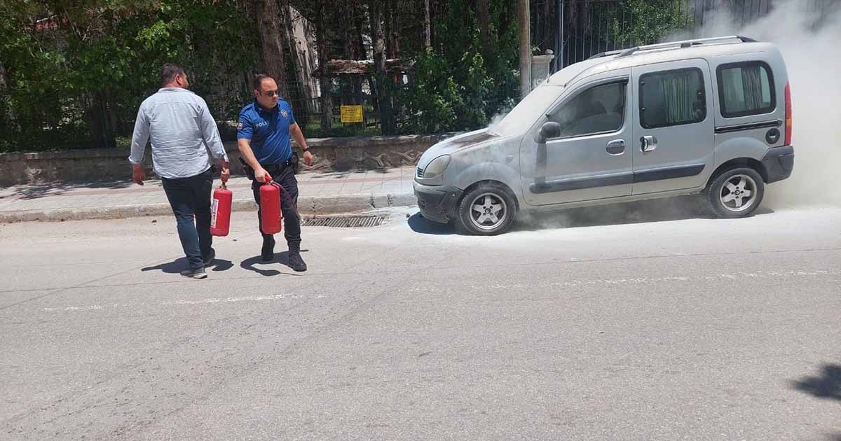 Afyonkarahisar'ın Şuhut İlçe Emniyet Müdürlüğü binasının önünde bir anda alev alan araç polislerin yangın tüpleri ile yaptığı müdahale sonrası söndürüldü.