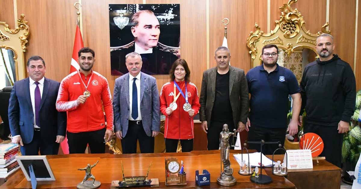 Yunusemre Belediye Başkanı Semih Balaban, Yunusemre Belediyespor'un milli judocuları Sura Nil Karasu ve Enes Pınar'ı makamında ağırlayarak başarılarından dolayı kutladı.