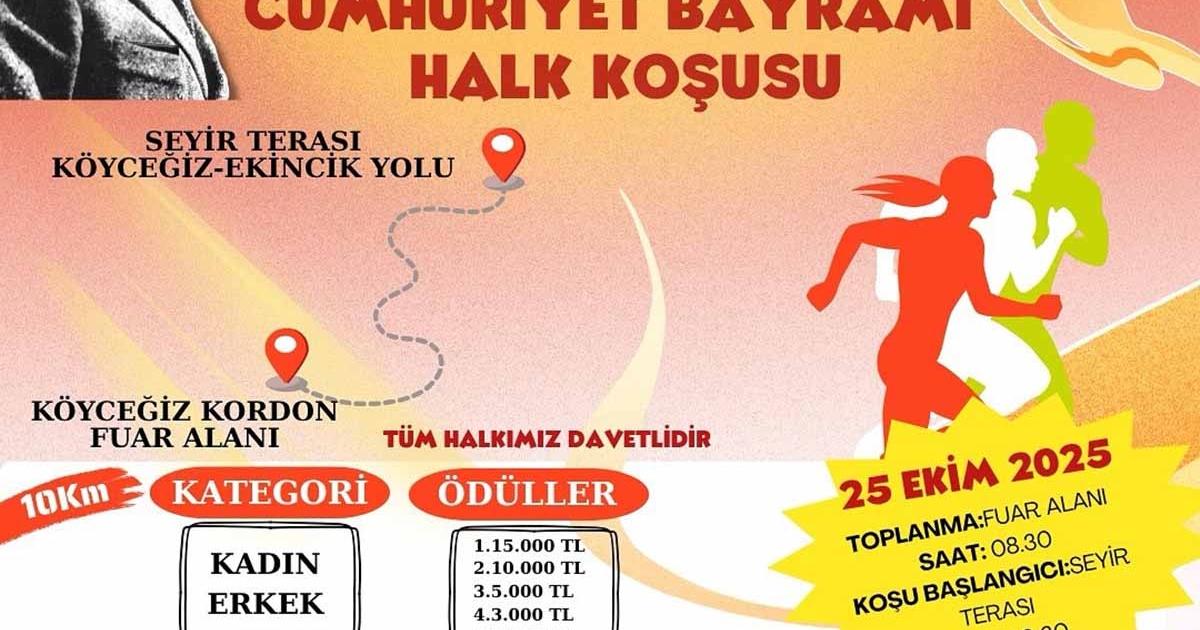 29 Ekim Cumhuriyet Bayramı halk koşusuna katılacak sporcular 25 Ekim 2025 tarihinde Köyceğiz Atatürk Kordonu Fuar Alanı’nda saat 08.30’da toplanacak. Sporcular koşu başlangıç noktası olan Köyceğiz Ekincik Yolu Seyir Terası’na taşınacak. 29 Ekim Cumhuriyet Bayramı halk koşusu saat 10.30’da Köyceğiz Ekincik Yolu Seyir Terası’ndan başlayacak, Köyceğiz Atatürk Kordonu Fuar Alanı’nda sona erecek. 10 Km’lik 29 Ekim Cumhuriyet Bayramı halk koşusunda para ödülü verilecek. Kadın ve Erkek kategorilerinde dereceye giren sporculara ödülleri takdim edilecek. Katılım için afişte yer alan başvuru koduna veya başvuru linkine tıklayarak başvuru yapılabilecek. Köyceğiz Kaymakamlığı tarafından 29 Ekim Cumhuriyet Bayramı halk koşusuna, Cumhuriyetin coşkusunu yaşamak için tüm halk davet edildi.