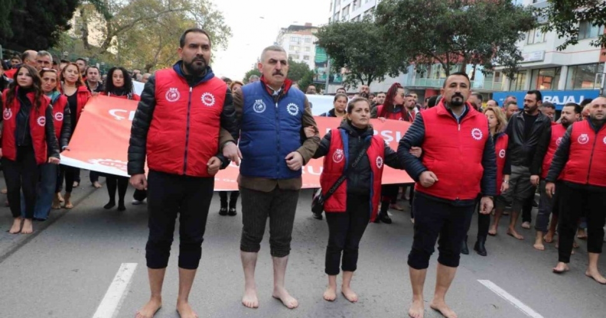 İzmir Büyükşehir Belediyesi şirketlerinde çalışan işçiler, aylardır ödenmeyen hakları ve işten çıkarmalara tepki göstermek amacıyla sendika binasından Kültürpark’a kadar çıplak ayakla yürüdü. DİSK Genel-İş İzmir 2 No’lu Şube Başkanı Ercan Gül, "İzmir Büyükşehir Belediyesi Başkanı Cemil Tugay’ın ‘Sendikalar agresif davranıyor, aylardır eylem yapmadıkları için kendilerini hatırlatmak istiyorlar.’ şeklindeki açıklamaları gerçeği yansıtmamaktadır. Biz kendimizi hatırlatmak için değil, üyelerimizin dört aydır ödenmeyen hakları ve havuzda bekletilen arkadaşlarımızın çilesi için buradayız" dedi.