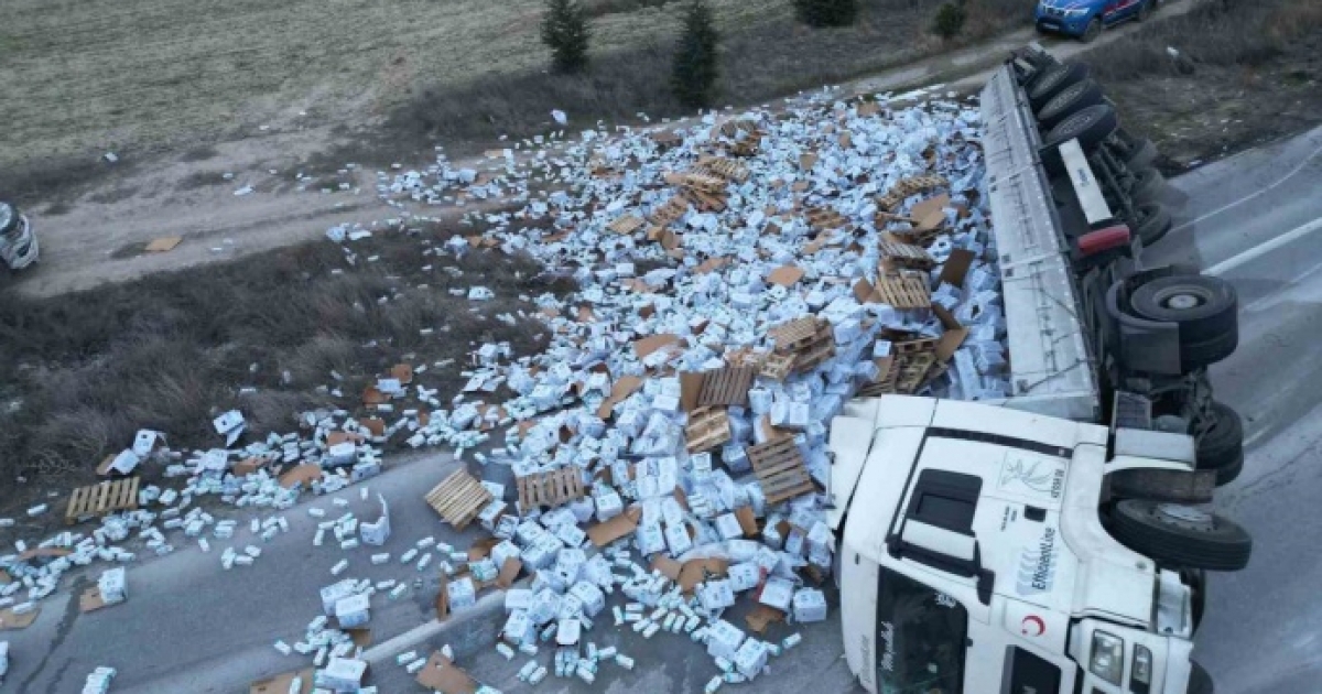 Afyonkarahisar’da yaklaşık 25 ton pastörize süt yüklü tırın kontrolden çıkarak devrilmesi sonucu karayolu yaklaşık yarım saat çift yönlü trafiğe kapandı.