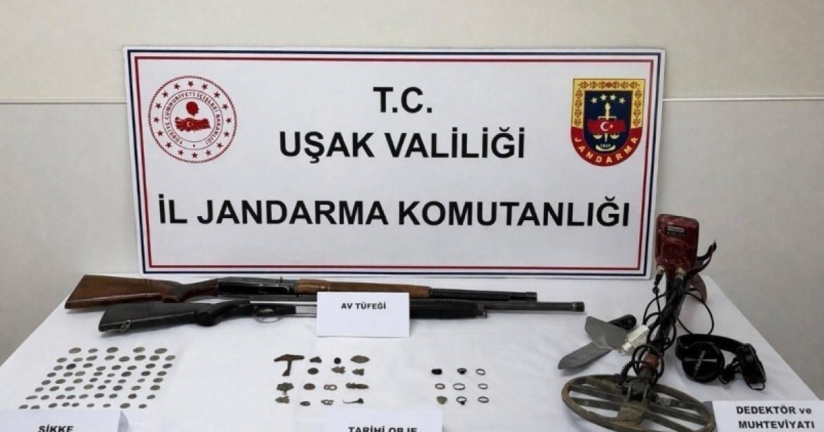 Uşak İl Jandarma Komutanlığı ekipleri tarafından kaçakçılık olaylarının önlenmesine yönelik yürütülen çalışmalar kapsamında Banaz ilçesine bağlı Yenice köyünde ikamet eden A.Ö.’nün evinde arama yapıldı. Yapılan aramada 63 sikke ile 24 tarihi obje, 1 dedektör ve 2 ruhsatsız av tüfeği de bulundu ele geçirildi.