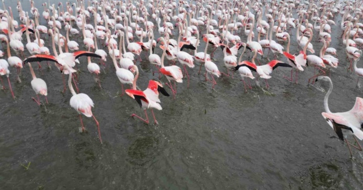 Zarif duruşları ve göz alıcı renkleriyle bilinen flamingolar, Eber Gölü’ne gelerek adeta görsel bir şölen başlattı. Gölün sığ sularında beslenen yüzlerce flamingo, bölgeyi pembe ve beyaza bürüdü. Ortaya çıkan bu renkli görüntüler, doğaseverler ve fotoğraf tutkunları için eşsiz kareler sundu.