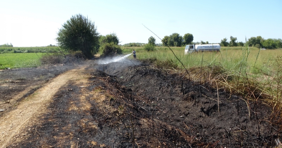 Manavgat ilçesinde tarım arazisinde çıkan yangın, Manavgat ırmağından su doldururken dumanları görerek müdahalede bulunan belediyeye ait su tankeri sayesinde büyümeden söndürüldü.