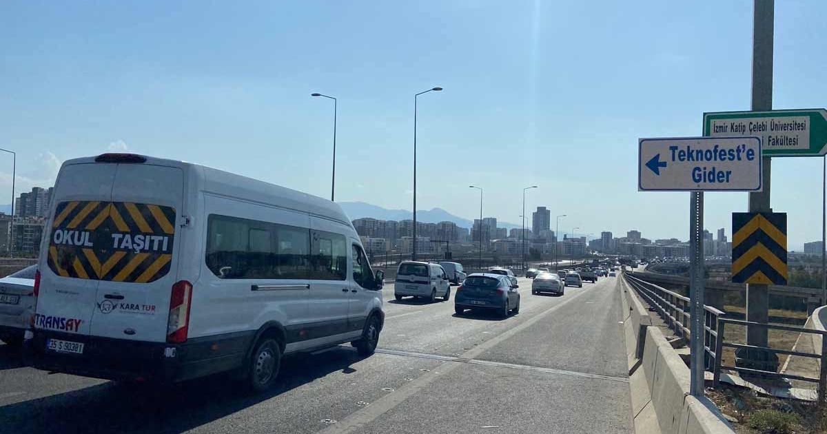 Sanayi ve Teknoloji Bakanlığı ile Türkiye Teknoloji Takımı Vakfı (T3) yürütücülüğünde düzenlenen havacılık, uzay ve teknoloji festivali TEKNOFEST İzmir’in dördüncü gününde hafta sonu yoğunluğu yaşanırken, trafikte oluşan kilometrelerce araç kuyruğu havadan görüntülendi.