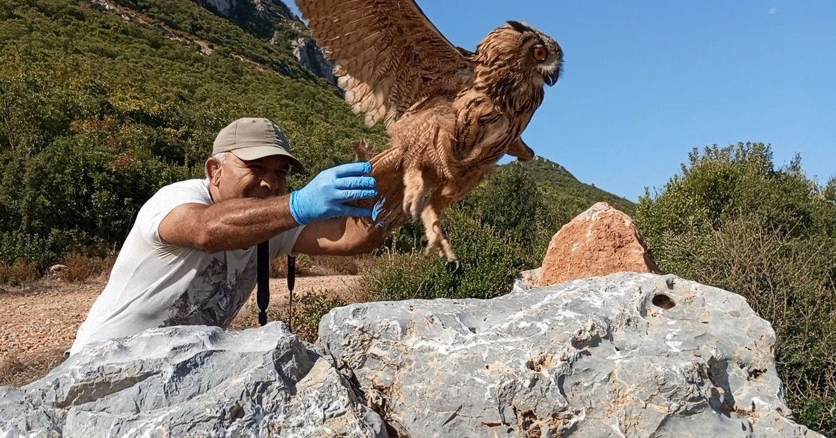 Aydın’ın Kuşadası ilçesinde bitkin ve yaralı halde bulunduktan sonra tedavisi tamamlanan Puhu kuşu (Bubo bubo türü baykuş) doğaya salındı.