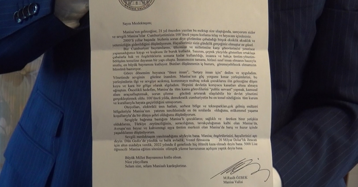 "Sayın meslektaşım, Manisa'nın geleceğine 21 yıl önce yazılan bu mektup size ulaştığında sanıyorum sizler ve sevgili Manisalılar cumhuriyetin 100. yaşını kutlama telaşı içerisindesiniz. 2000'li yıllar başında bizlerin sorun diye çözümüne çalıştığı birçok eksiklik, aksaklık ve yetersizliğin giderildiğini düşünüyorum. Hayallerimiz sizlerin gerçeği olmuştur. Ne güzel. Biz cumhuriyet bayramlarını ülkemize ve milletimize karşı görevlerimizi yeterince yapamadığımız kaygı ve kuşkusuyla buruk kutladık. Sanıyorum çeyrek yüzyılda ortak çabalarla hak ve özgürlüklerin sonuna kadar kullanıldığı, insanca ve hakça üretim, yönetim, paylaşım temeline dayalı bir yapı oluştu. İnsanımızın tamamı birinci insan olmanın hazzıyla mutlu ve en büyük bayramını kutluyor. Bunları düşünmenin iç huzuru, göremeyecek olmanın hüznünü de bastırıyor. Görev dönemim boyunca önce insan dedim ve uyguladım. Yönetimde sevginin gücüne inandım. Manisa'nın göç yorgunu kenar yerleşimlerini, bu yerlerin ilgi ve sevgiye aç korunmaya muhtaç sokak çocuklarını, ilin geleceğine düşen koyu ve kara bir gölge olarak algıladım. Hepsini devletin koruyucu kanatları altına almaya uğraştım. Öncelikli hedefim Manisa'daki tüm kamu görevlilerini 'Public Server' yapmak. Kamusal alanları araçsallaştırmak, sorun çözme gücünü artırarak, ulaşılabilir bir devlet yönetimi gerçekleştirmek oldu. 100. yılda demokratik cumhuriyetin bu en temel niteliğinin tüm kurum ve kurallarıyla hayata geçirilebildiğini ümit ediyorum. Otoyolları, elektrikli tren hatları, serbest bölgeleri ve teknoparklarıyla çok gelişmiş endüstri bölgeleriyle Manisa'nın yatırım tercihleriyle en ön sıralarda olduğunu ve mükemmel yaşama koşullarıyla bir dünya şehri olduğunu düşünüyorum. Sevgiyle bağrıma bastığım Manisalı çocukların sağlıklı ve üretken birer yetişkin olduklarını, Türkiye zeytinciliğinin, seracılığının, tavukçuluğunun kalbi olan Manisa'dan Avrupa'nın beyaz ve kahverengi eşya üretim merkezi olan Manisa'da barış ve huzur içerisinde yaşadıklarını düşünüyorum. Sevgili meslektaşım yanılmadığımı söyleyin lütfen bana. Manisa öngörüleriniz hayallerini aştı deyin. Dün Gediz'de yüzdük ve balık avladık, Vestel firmasına 20 milyar dolarlık ihracatı için altın madalya verdik, 2022 yılında il genelinde hiç ölümlü kaza olmadı deyin bana. 5 bin lise öğrencili Manisa eğitim sitesinin, olimpik yüzme havuzunun açılışını yaptık deyin bana. Büyük millet bayramınız kutlu olsun. Nice yüzyıllara, selam sizlere, selam Manisalı kardeşlerime."