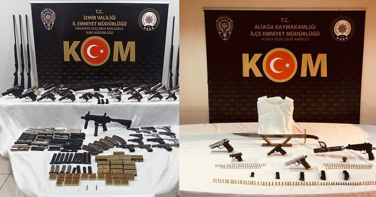 İzmir Cumhuriyet Başsavcılığı koordinesinde; silah ticareti, tefecilik ve tehdit suçlarını işlediği tespit edilen 4 organize suç örgütüne yönelik İzmir polisi tarafından operasyon yapıldı. İzmir merkezli olmak üzere; Ödemiş, Tire ve Aliağa ilçelerinde düzenlenen operasyonda; 2 adet otomatik tabanca, 100 adet tabanca, 80 adet tüfek, 54 adet kurusıkı tabanca, 585 adet tabanca şarjörü, 3 bin 764 adet tabanca fişeği, 139 adet tüfek kartuşu, 3 adet çelik yelek, 173 adet Piroteknik madde, 3 bin 488 adet patlayıcı madde ele geçirildi.