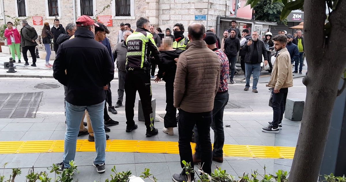 Olay, Cevat Şakir Caddesi üzerinde öğle saatlerinde meydana geldi. Edinilen bilgiye göre, Ş.B. idaresindeki 34 BZM 236 plakalı otomobil, sürücüsünün direksiyon hakimiyetini kaybetmesi sonucu belediye meydanı girişinde kaldırıma çıktı. Park halindeki elektrikli scooterlara çarpıp dubaları, aydınlatma direğini ve çöp kovasını deviren otomobil, altında kırık duba ile bir süre seyretti. Kaza sonrası otomobilin sürücüsü durmayıp kaçmaya çalıştı. Sürücü Ş.B. ve yanındaki M.Y. isimli kadın vatandaşlar tarafından durdurdu.