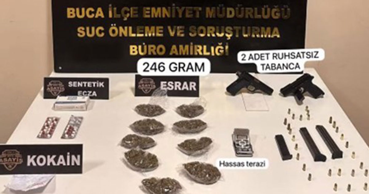 İzmir'in Buca ilçesinde polis ekipleri tarafından bir haftada gerçekleştirilen huzur uygulamalarında, çok sayıda uyuşturucu madde ve ruhsatsız silah ele geçirilirken, çeşitli suçlardan adli makamlara sevk edilen 42 şüpheli tutuklandı.