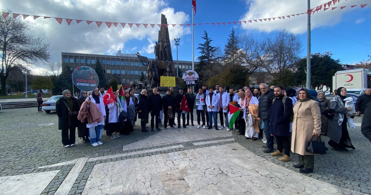 Sağlık çalışanları adına konuşma yapan Aile Hekimi Dr. Musa Öz ise “310 sağlık çalışanı ve 97 hekim öldürüldü. Şifa Hastanesi başhekimi, el Awda Hastanesi müdürü dahil 99 hekim ve sağlık çalışanı işgalciler tarafından tutuklandı. Hastanelerden, ailelerinin yanından gözaltına alınıp, kıyafetleri zorla çıkartılarak elleri bağlı şekilde bilinmeyen yerlere götürülüp alıkonulan sivillerin katledildiği haberleri geliyor. İşgal güçleri insanlığa ait tüm değer ve sınırları çiğneyerek katliamlarına devam ediyor. 52 bin 600 konut, 282 okul ve üniversite, 126 hükümet binası, 112 cami, 23 hastane, 53 sağlık ocağı bombalarla tamamen yıkıldı. 102 ambulans imha edildi. 254 bin konut, 200 cami, 3 kilise, 140 sağlık kuruluşu saldırılarla hedef alındı. Tahrip edildi ve kullanılamaz durumda. Zulüm bunlarla da bitmiyor. Enkazlar kaldırılamıyor. Yaralılara ulaşılamıyor ve 7 bin kişi hala kayıp.” ifadelerini kullandı.