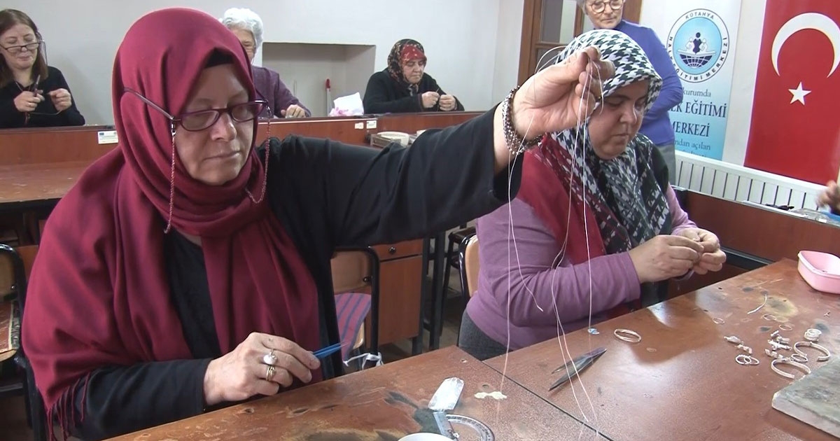 Kütahya'da belediye ve Halk Eğitim Merkezi Müdürlüğü tarafından açılan kursta kadınlara telkari gümüş işlemeciliği öğretiliyor.