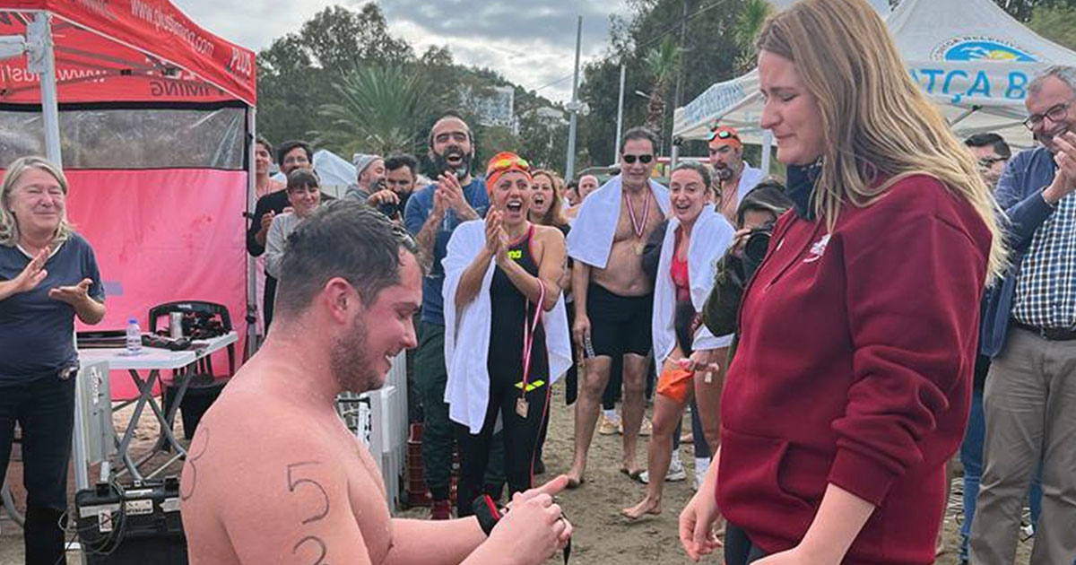 Datça ilçesinde bu yıl 18’incisi düzenlenen kış açık deniz yüzme maratonuna İstanbul’dan katılan yüzme antrenörü Kaan Peyami Orhan, 3 bin metrelik parkuru tamamladıktan sonra sahile geldiğinde anons yapan görevliye kız arkadaşına evlilik teklifi yapacağını ve yarış bitiş alanına davet etmesini istedi.