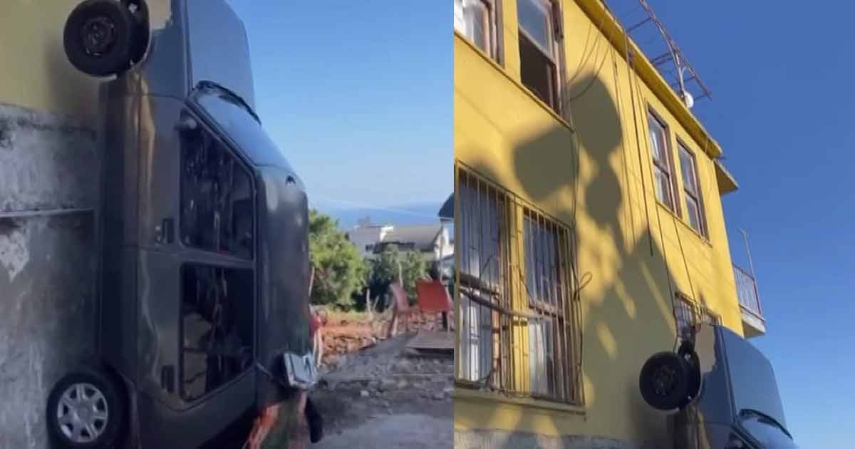 Antalya'nın Alanya ilçesinde bir vatandaş kazaya karışan aracını iple binadan aşağıya sarkıttı. Aracı binaya dik şekilde asılı halde gören vatandaşlar hayrete düştü.