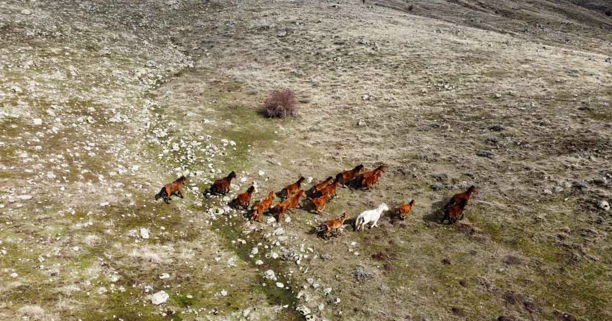 Sıcak havalarının iyiden iyiye hissedildiği Afyonkarahisar’da doğa adeta baharı beklemeden uyandı. Bolvadin ilçesine bağlı Kemerkaya beldesindeki Yapraklı Yaylası’nda dron ile görüntülenen yılkı atları sevimlilikleri ile görenleri gülümsetti. Yiyecek aradıkları gözlenen yılkı atı sürüsü ürkeklikleri ile dikkat çekerken, atların sürü halinde gezmeleri ise bir başka dikkat çekici konu oldu. Atların dronu fark ederek sürekli yer değiştirip hareket halinde oldukları da gözlendi. Yılın belli dönemlerinde görüntülenen yılkı atlarının sürekli sürü halinde gezmeleri ise dikkatlerden kaçmadı.