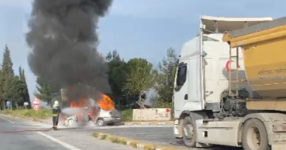 Aydın’ın Germencik ilçesinde otoyolu çıkışında bir otomobil alev alırken, itfaiye ekipleri alev topuna dönen araca müdahale etti.