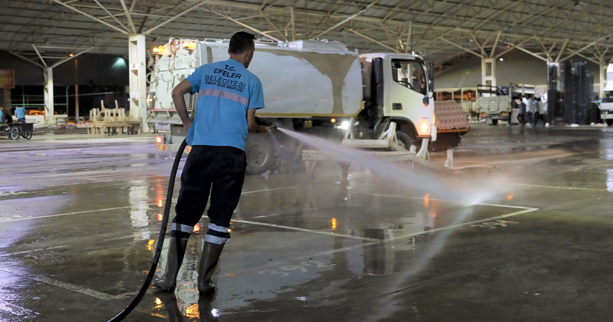 Efeler Belediyesi Temizlik İşleri Müdürü ekipleri, kentin farklı noktalarında kurulan semt pazarlarının temizliğini sürdürüyor.