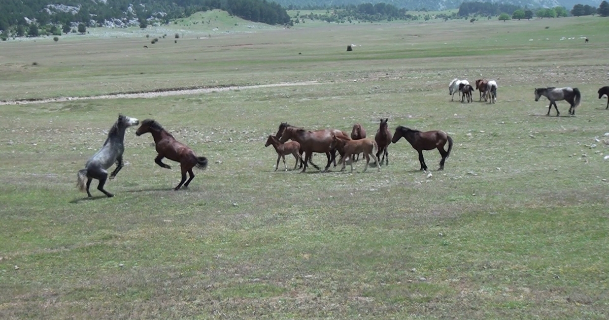 Antalya'nın İbradı ilçesi Ormana Mahallesi sınırlarında bulunan “Eynif Ovası”nın en önemli değerlerinden olan ve 90 bin dönümlük düz ovada yavrularıyla birlikte özgürlüğün tadını çıkartan Yılkı atları karadan ve havadan görüntülendi.