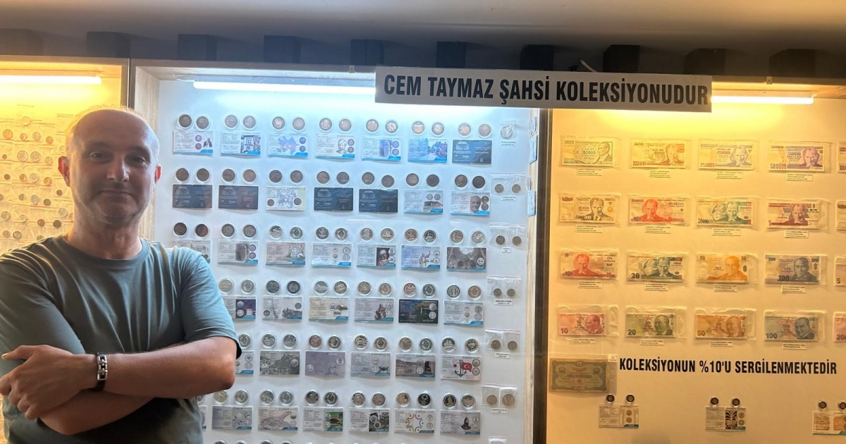 Aydın’ın Kuşadası ilçesinde küçük yaşlardan itibaren biriktirdiği paralarla özel bir koleksiyona sahip olan Cem Taymaz, bu koleksiyonunu kendisine ait kafede cam bölmede sergiliyor.