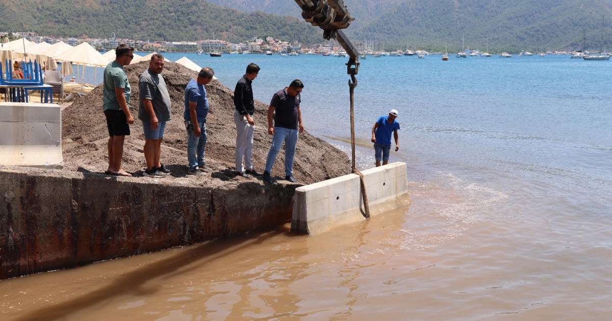 Marmaris'te Ketenci Deresi’nin ağzını deniz kumlarıyla kapanmaması için beton bariyer yerleştirildi.