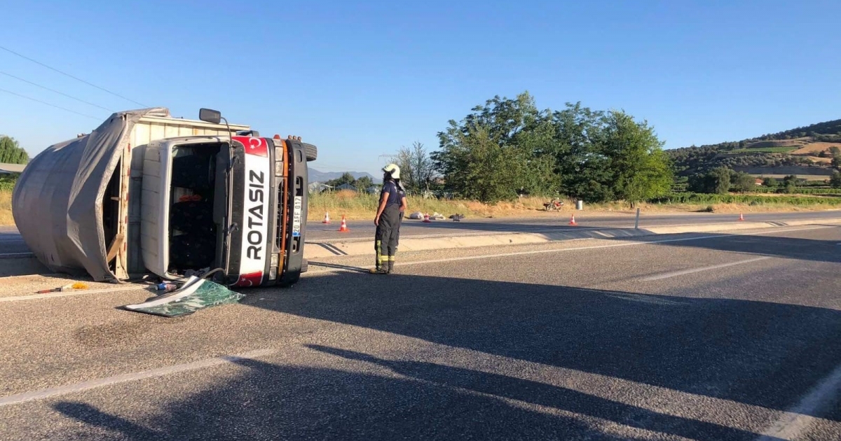 Manisa'nın Sarıgöl ilçesi Dindarlı Mahallesinde seyir halindeki bir kamyon, önüne çıkan köpeğe çarpmamak için sürücüsünün direksiyon hakimiyetini kaybetmesi sonucu devrildi. Kazada kamyonda bulunan iki kişi yaralandı.