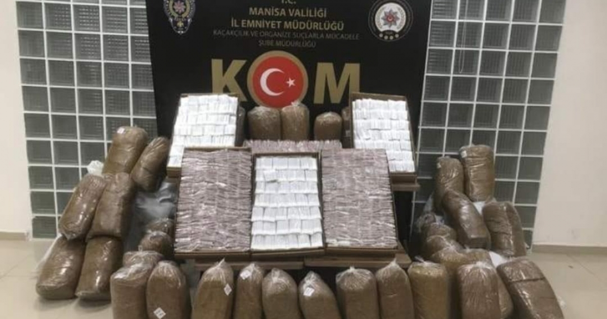 Manisa'nın 5 ilçesinde emniyet ekipleri tarafından yapılan operasyonlarda çok sayıda bandrolsüz tütün ve gümrük kaçağı sigara ele geçirildi.
