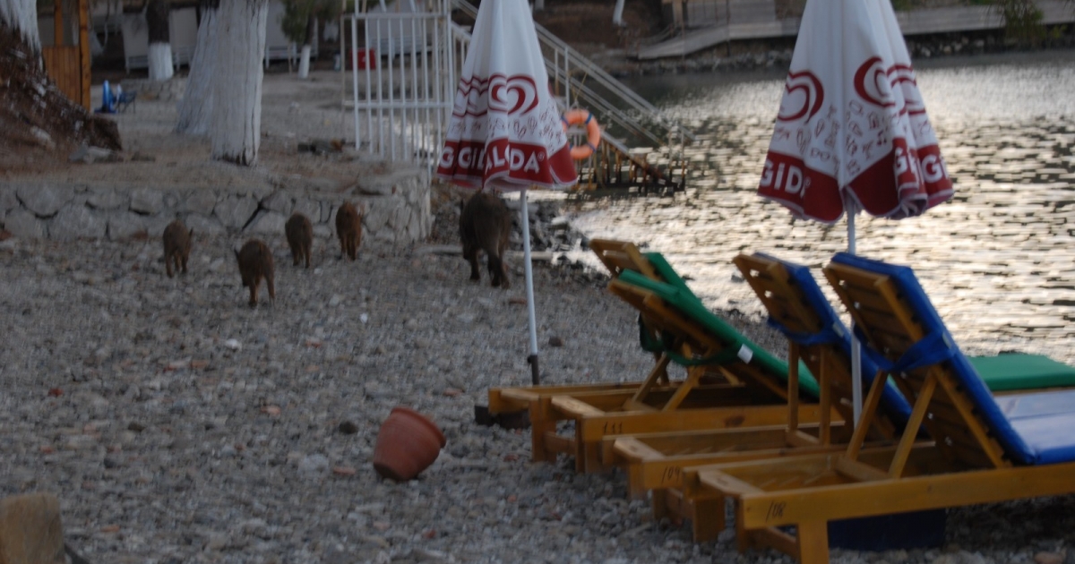 Fethiye'de yarımada çevresindeki bir koyda plaja inen irili ufaklı domuz sürüsü, kimseye aldırış etmeden yiyecek aradı. Özel localar ve şezlonglar arasında yiyecek arayan, buldukları karpuz kabuğu ve diğer yiyecekleri yiyen domuz sürüsünü gören tatilciler ise şaşkınlığını gizleyemedi. Tatilciler cep telefonları ile bu anı görüntülemeye çalışırken, domuz sürüsü yavrularıyla birlikte daha sonra ormanlık alana geri döndü.