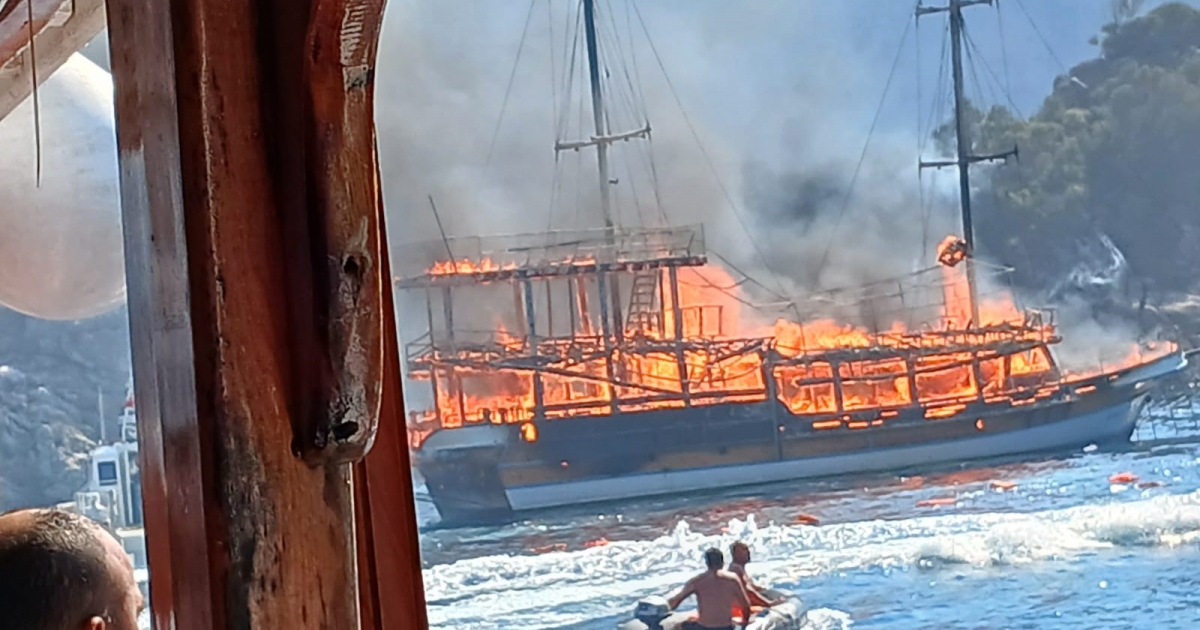 Muğla Marmaris ile Yunanistan açıklarında ahşap bir gezi teknesinde yangın çıktı. Kısa sürede tüm tekneyi saran alevlerden yolcular ve mürettebat denize atlayarak kurtulurken, adeta can pazarı yaşandı. Başka teknelerle mavi tura katılan pek çok kişi feci yangın karşısında panik yaşadı ve gözyaşlarına hakim olmadı.