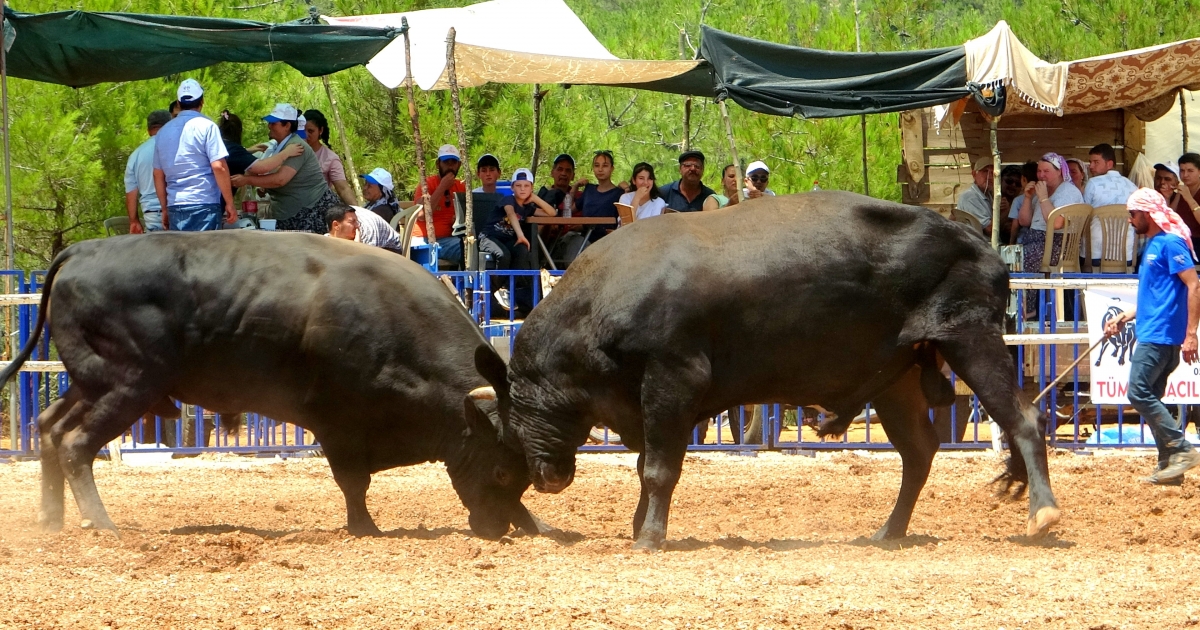 Muğla'nın Menteşe ilçesinde bu yıl 10'uncusu düzenlenen boğa güreşi festivalinde boğalar kıran kırana mücadele etti.