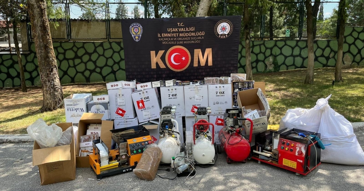 Uşak İl Emniyet Müdürlüğü'ne bağlı Kaçakçılık ve Organize Suçlarla Mücadele Şube Müdürlüğü ekipleri, edinilen bilgiler çerçevesinde bir adrese operasyon düzenledi. Operasyonda 148 bin 400 adet kaçak makaron, 70 bin gram kıyılmış tütün, 3 adet sigara sarma makinesi ve 3 adet kompresör ele geçirildi.