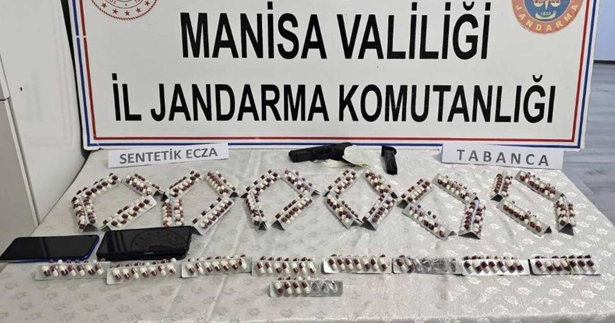 Manisa İl Jandarma Komutanlığı İstihbarat Şube Müdürlüğünce yapılan araştırmalar neticesinde; İstihbarat ve KOM Şube Müdürlüğü ile Yunusemre İlçe Jandarma Komutanlığı ekiplerince T.K. (36/ E) isimli şahsın evinde yapılan aramada; 915 adet sentetik ecza hapı, 2 adet cep telefonu, 1 adet kuru sıkı tabanca ele geçirildi. Şüpheli T.K. hakkında adli tahkikata başlanıldığı bildirildi.