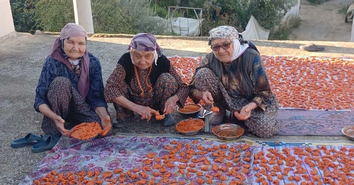 Sarıgöl'ün Dadağlı Mahallesinde yaşayan Pakize Tosun (90), Ümmü Kılıç (90) ve Ümmü Ergin (90) her yıl kışlık yiyeceklerini birlikte hazırlıyorlar. Özellikle ev tarhanasını mutlaka üçü birlikte yapıyor. 90 yaşındaki üç mahalle arkadaşı ve gelinleri ile birlikte evlerinin üstündeki betonun üzerine sabahın ilk ışıklarında birlikte yaş olan tarhanaları kuruması için birlikte sermeye başladı.