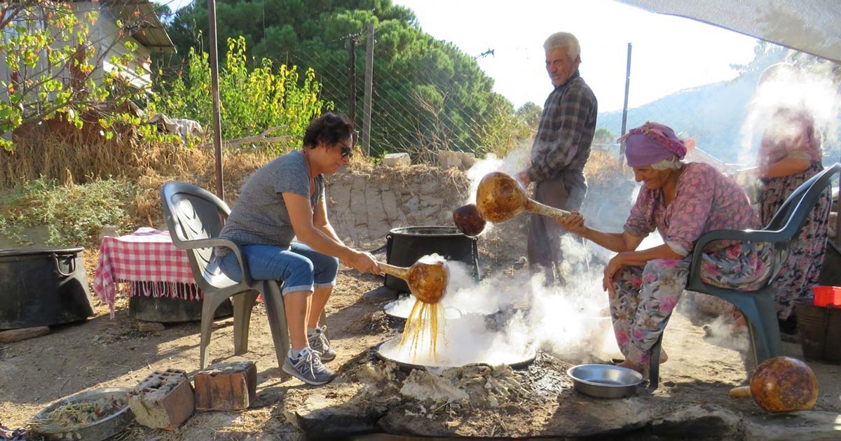 Bağcılar Mahallesi, sadece Aydın'ın değil, Ege Bölgesi'nin de en önemli pekmez üretim yerlerinden biri olarak öne çıkıyor. Her sonbaharda olduğu gibi bu yıl da pekmez üretimi geleneksel yöntemlerle gerçekleştiriliyor.
