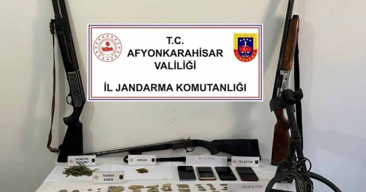 Olay, Çay ilçesinde meydana geldi. Edinilen bilgilere göre, Afyonkarahisar İl Jandarma Komutanlığı ekipleri Çay ilçesine bağlı Pazarağaç ve Karamıkkaracaören beldelerinde ikamet eden M.S., M.K., M.G. ve A.G. isimli şahısların uyuşturucu sattıkları yönünde bilgi aldı. Ardından harekete geçen ekipler şahısların evlerine baskın düzenleyerek aynı zamanda araçlarında da arama yaptı. Aramada 9.7 gram esrar, 41 adet sikke, 84 adet tarihi obje, 3 adet av tüfeği, el dedektörü ve 4 adet cep telefonu ele geçirildi. Olayın ardından gözaltına alınan şahısların jandarmadaki işlemlerinin devam ettiği bildirildi.