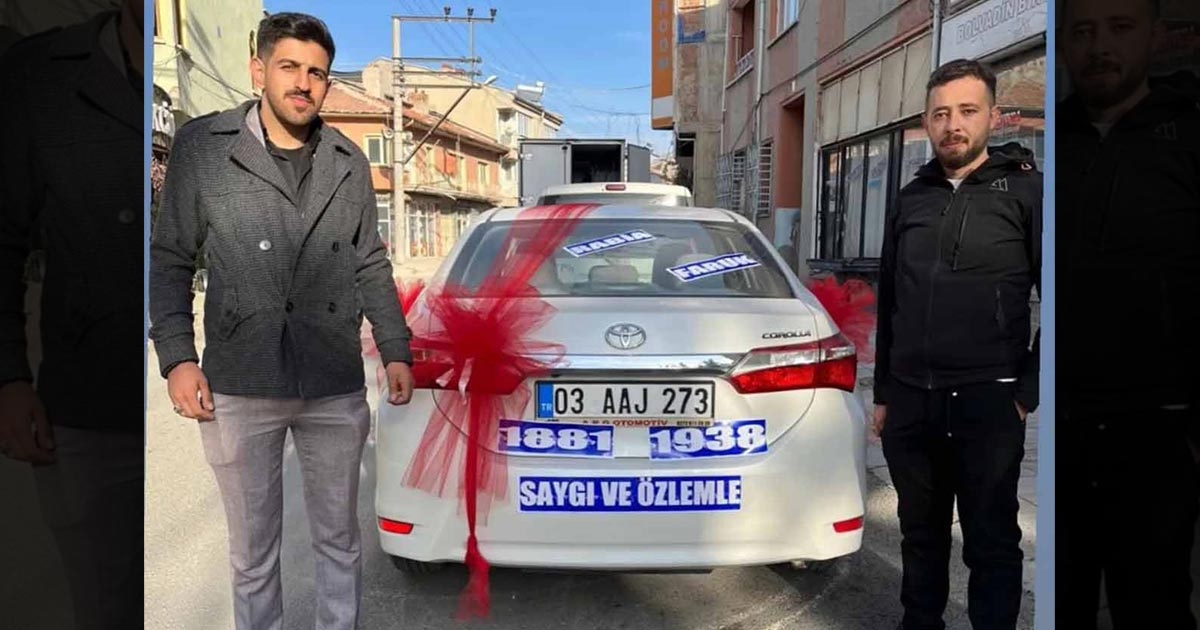 Afyonkarahisar’da bugün dünya evine giren bir çift Mustafa Kemal Atatürk’ü unutmayarak, gelir arabasının arkasına ‘Saygı ve Özlemle’ yazdırdı.