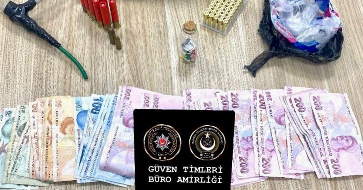 İzmir Asayiş Şube Müdürlüğü Güven Timleri Büro Amirliği ekipleri, 29 Kasım günü Konak ilçesinde uyuşturucu madde satışı yapan şahıslara yönelik operasyon gerçekleştirdi. Yapılan aramada, 112.55 gram metamfetamin, bir miktar esrar maddesi ve sentetik hap, uyuşturucu kullanmaya yarayan düzenek ile kuru sıkıdan bozma 1 ruhsatsız tabanca, 43 fişek, 10 av tüfeği kartuşu ve uyuşturucu ticaretinden elde edildiği değerlendirilen 5 bin 100 TL nakit para ele geçirildi.