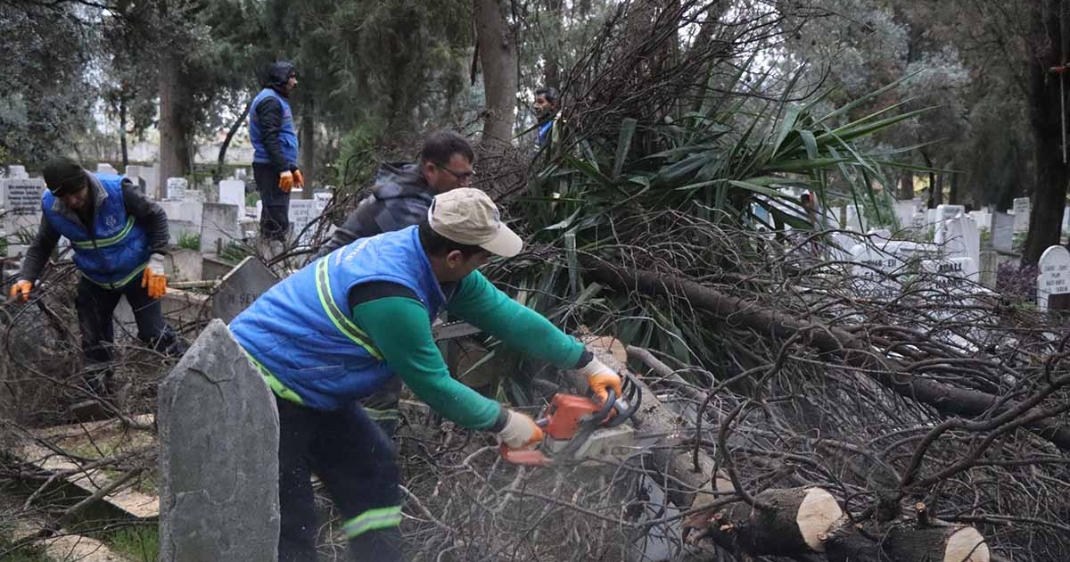 Bazı mezar taşlarına zarar verdiği tespit edilen ağaçlar, Park ve Bahçeler Müdürlüğü personelleri tarafından şantiyeye taşınarak ihtiyaç sahiplerine ulaştırılmak üzere çuvallara konuldu.