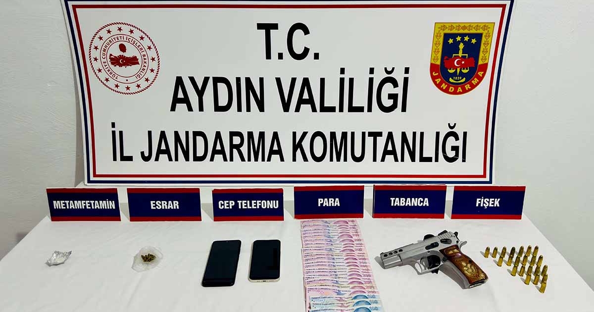 Kuşadası İlçe Jandarma Komutanlığınca uyuşturucu madde imal ve ticaretine yönelik çalışmada Kuşadası ilçesinde yılbaşı terbileri kapsamında Güzelçamlı Mahallesi’nde asayiş ekiplerimiz tarafından icra edilen Şok Yol Kontrol faaliyetinde K.C.T (22) ve Y.B (22) isimli şüpheli şahıslar yakalanarak üzerlerinde arama yapıldı. Yapılan aramada bir miktar esrar ve metamfetamin 7.65 mm çapında ruhsatsız tabanca, 2 adet cep telefonu, 3 bin 375 TL suçtan elde edildiği değerlendirilen nakit para ele geçirildi. Şüpheliler hakkında adli sürecin devam ettiği öğrenildi.