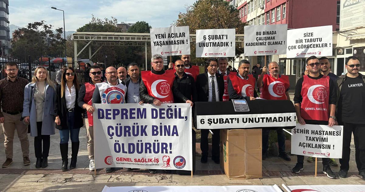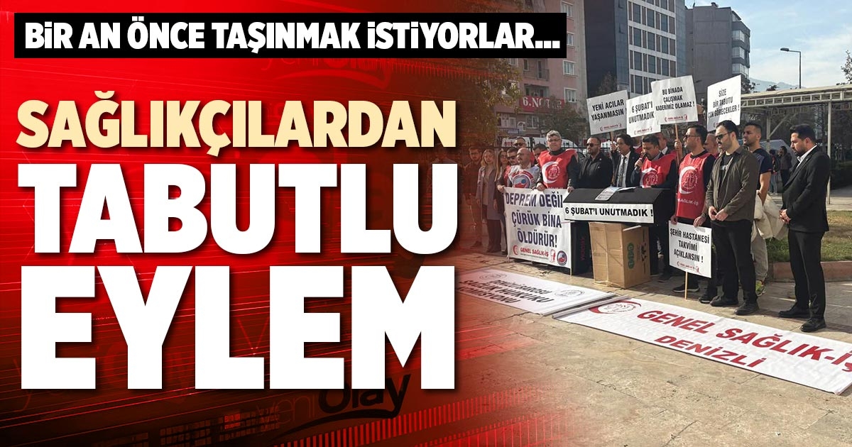 Genel Sağlık İş üyeleri, Denizli Devlet Hastanesi önünde eylem yaptı, depreme dayanıksız binadan bir an önce taşınmak istediklerini açıkladı. Tabutlu eylemde, yapımı tamamlanan Şehir Hastanesi’ne taşınma sürecinin şehir efsanesine dönüştüğü ifade edildi.