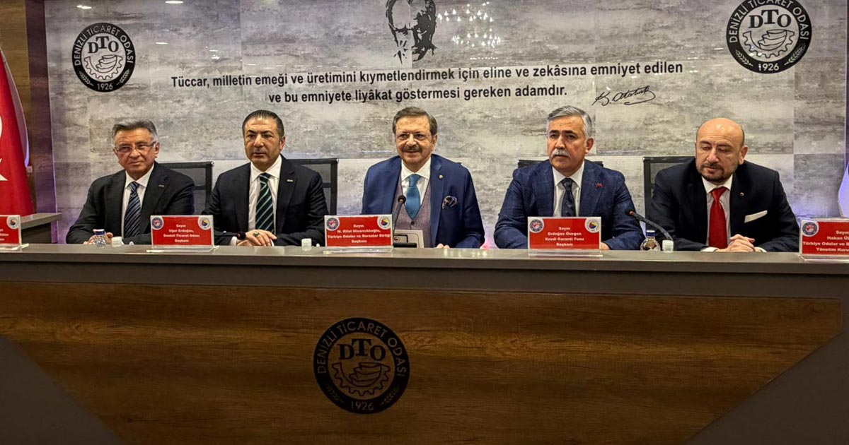 Türkiye Odalar ve Borsalar Birliği Başkanı Rifat Hisarcıklıoğlu, Denizli temasları kapsamında Denizli Ticaret Odası’nı ziyaret ederek iş dünyasıyla bir araya geldi. DTO Başkanı Uğur Erdoğan, reel sektörün yaşadığı sıkıntıları aktarıp çözüm talep ederken, Hisarcıklıoğlu DTO’nun yeni hizmet binasına destek sözü verdi.