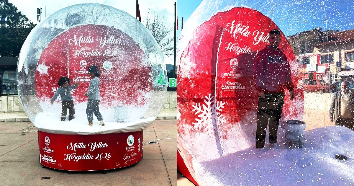 Beyağaç Belediyesi vatandaşların yılbaşı hatıralarını renkli şekilde ölümsüzleştirmeleri için Beyağaç Çarşı Meydanına dev kar küresi yerleştirdi.
