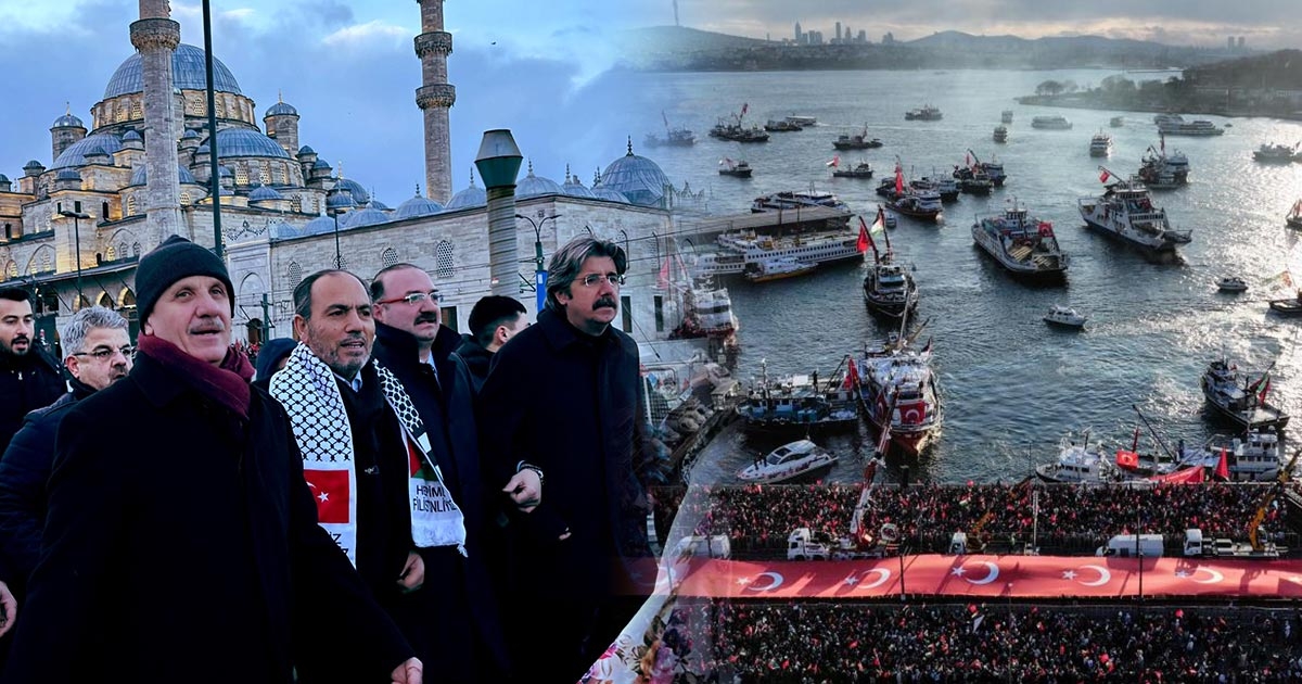 Ayasofya-i Kebir Cami-i Şerifi, Yeni Cami, Sultanahmet, Fatih ve Süleymaniye camilerinde kılınan sabah namazının ardından katılımcılar Galata Köprüsü'ne akın etti. Köprü üzerinde Türkçe ve İngilizce "Gazze İçin Adalet", "Gazze’deki Soykırımı Durdurun" yazılı dev pankartlar ile Türk ve Filistin bayrakları açılırken, köprünün yanlarına ise "Long Live Palestine (Çok Yaşa Filistin)" yazılı pankartları asıldı. Katılımcılar İsrail aleyhine sloganlar atıp, tekbir getirerek ellerinde Türk, Filistin ve Doğu Türkistan bayrakları taşıdı.