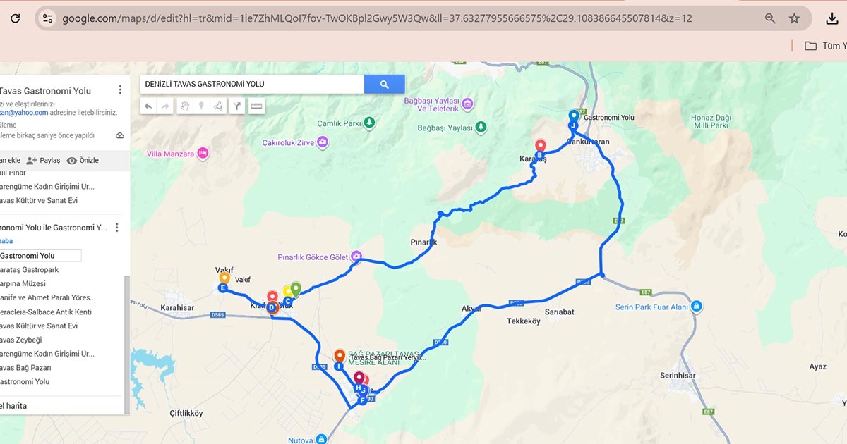 Denizli Tavas Gastronomi Yolu kapsamında Cankurtaran, Karataş, Pınarlık, Kızılcabölük, Vakıf ve Tavas güzergâhında yer alan noktalar arasında Karataş Mesireliği, Heracleia-Salbace Antik Kenti, Bağ Pazarı, Yarengüme Kadın Girişimi Üretim ve İşletme Kooperatifi ile Kültür ve Sanat Evi’nin yer aldığı bildirildi.