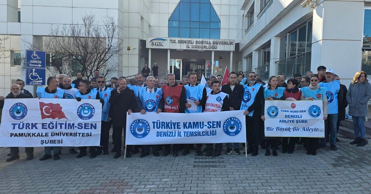 Kamu Sen üyeleri, Denizli Sosyal Güvenlik Kurumu önünden hükümete seslenerek enflasyon karşısında eriyen maaş sorununa kökten bir çözüm getirilmesini istedi.