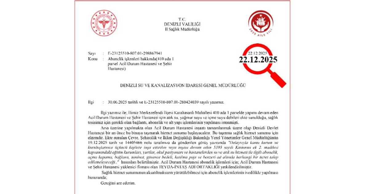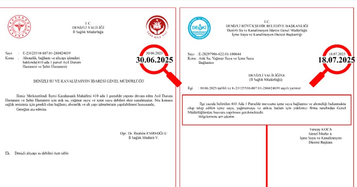 Denizli Büyükşehir Belediyesi DESKİ Genel Müdürlüğü, İl Sağlık Müdürlüğü’nün "6 ay bekledik" iddiasına, tarih ve sayı numaraları açıkça görülen resmi yazışma belgelerini yayınlayarak yanıt verdi. Ortaya çıkan belgeler, kurumun talebe zamanında dönüş yaptığına ancak yüklenici firmanın aylarca başvuru yapmadığına işaret etti.