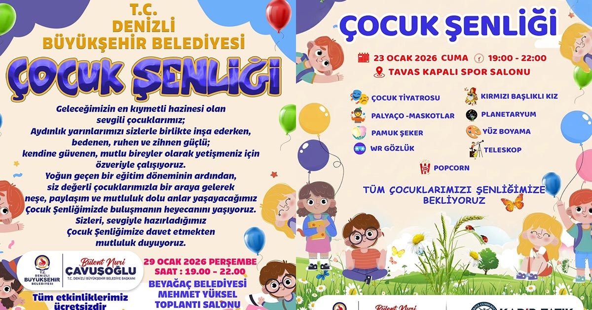 Çocukların yarıyıl tatilini keyifli ve eğlence dolu geçirmeleri amacıyla Denizli Büyükşehir Belediyesi ile Tavas Belediyesi iş birliğinde düzenlenen Yarıyıl Tatili Çocuk Şenliği, 23 Ocak Cuma günü Tavas’ta gerçekleştirilecek.