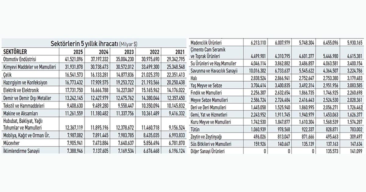 Tekstil ve hammaddeleri sektöründe ise 5 yıllık daralmanın yüzde 7 olarak gerçekleştiğini görüyoruz. 2021 yılı ihracatı 10,1 milyar dolar iken, 2022’de 10,4 milyar dolar, 2023’te 9,6 milyar dolar, 2024 yılında 9,5 milyar dolar, geçen yıl ise 9,4 milyar dolar tutarında tekstil ve hammaddeleri ihraç etmişiz. Hazır giyim hızlı ve sert bir düşüş yaşarken, tekstil hammaddesi daha dirençli ama aşağı yönlü daralma devam ediyor.
