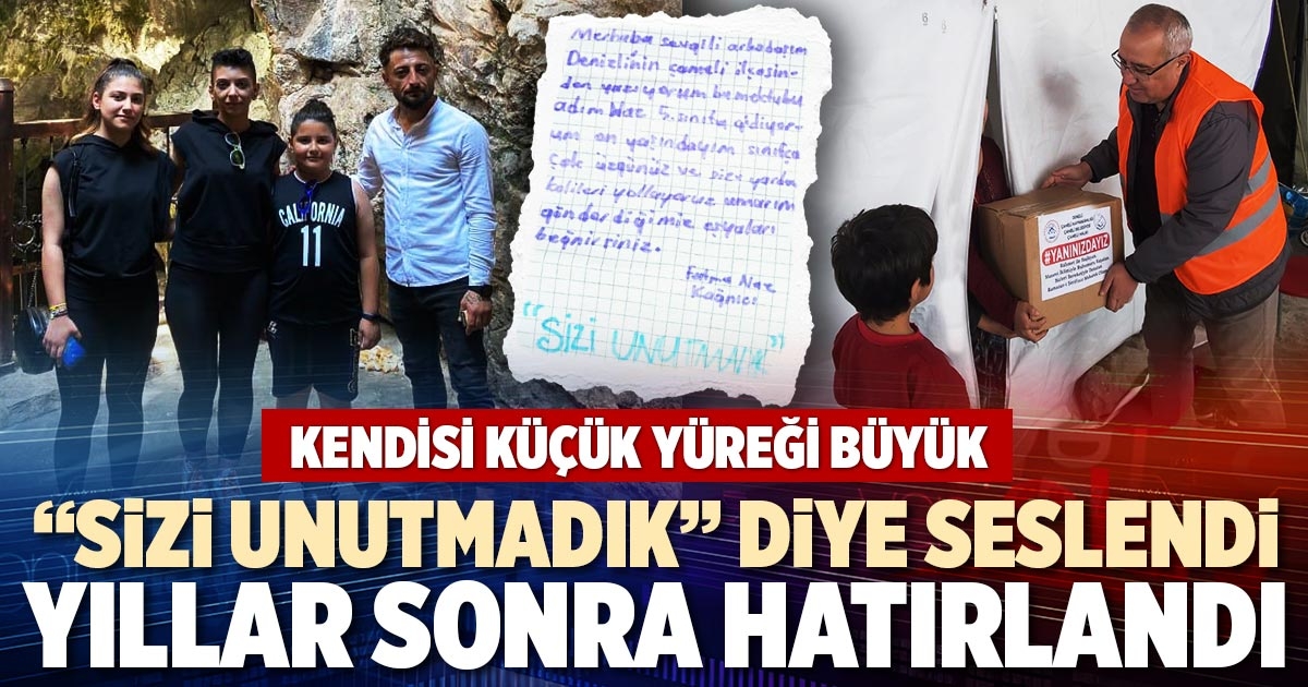 Küçük Fatma Naz depremzedelere yazdığı ve yardım kolisi içinde gönderilen mektubunda; “Merhaba sevgili arkadaşım. Denizli’nin Çameli İlçesi’nden yazıyorum bu mektubu. Adım Naz, 5. Sınıfa gidiyorum, 10 yaşındayım. Sınıfça çok üzgünüz ve size yardım kolileri yolluyoruz. Umarım gönderdiğimiz eşyaları beğenirsiniz. Sizi unutmadık” ifadelerini kullanmıştı.